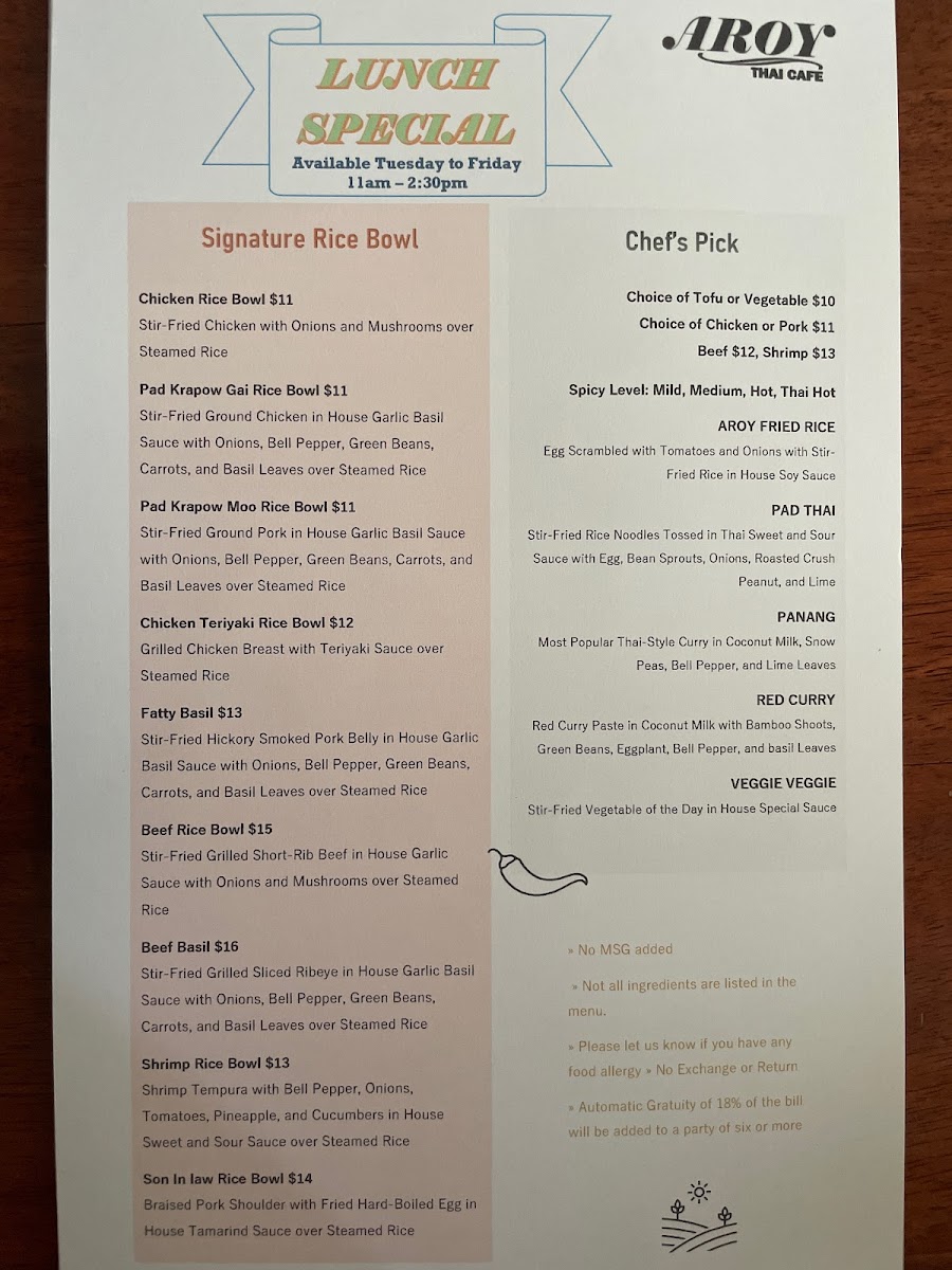 Customers rave about the fresh ingredients, friendly service, and vibrant atmosphere. With glowing reviews highlighting the delicious curry and comforting soups, Aroy Thai Cafe is not just a meal but an experience. Whether you're dining in or ordering out, the quality and authentic flavors will leave you wanting more!